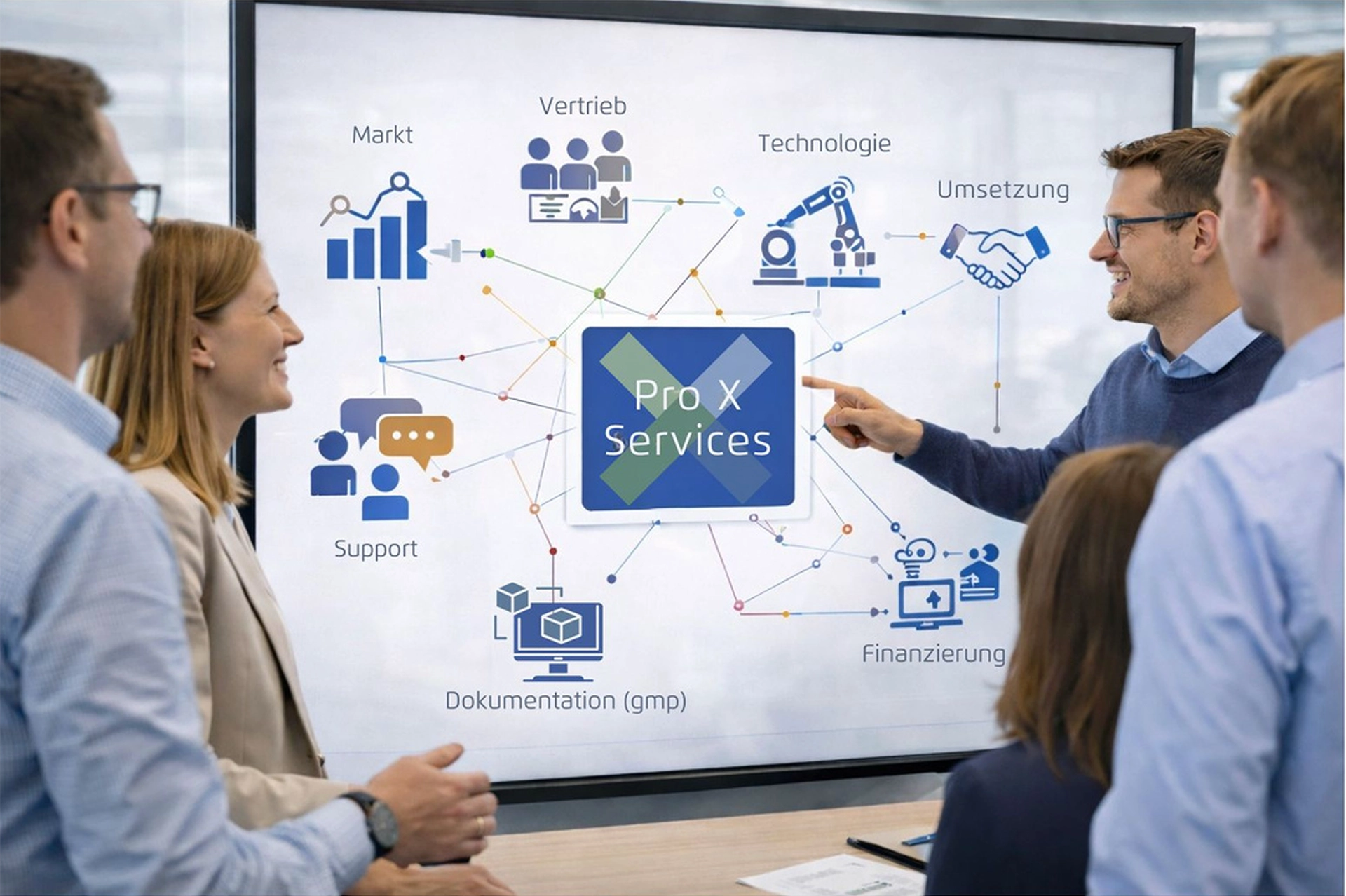 Erfolgreiche Innovationen entstehen durch das Zusammenspiel von Markt, Vertrieb, Technologie und Umsetzung. Deshalb basiert Pro X Services auf einem starken Netzwerk aus Partnern und Experten, das von Markt- und Vertriebsspezialisten über Technologiehersteller, Anlagenbauer und Servicepartner bis hin zu Forschungseinrichtungen sowie Projekt-, GMP- und Förderexperten reicht.